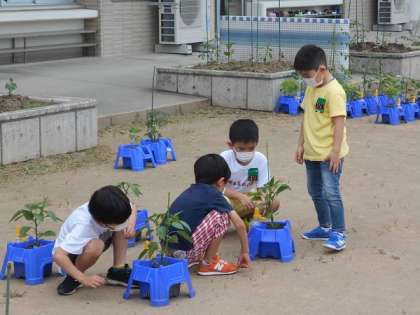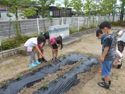 友達が育てた野菜や、サツマイモの畑の観察をしました。それぞれの野菜の葉の形を比べたり、サツマイモができるのは何月ころか予想したりしながら、楽しく屋外で学習しました。