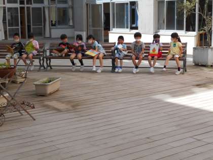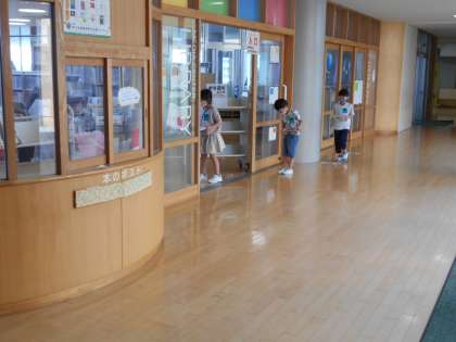 図書室では、学級を半分に分けるなど、3密に気を付けて本の貸し出しが行われています。一年生は、本を借りたら換気の良い中庭で、静かに待っています。