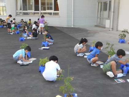 毎日の水やりのおかげで、野菜はぐんぐん生長しています。「花がさいている。」「実がなっている。」と、子供たちは前に観察したときと比べながら、しっかりと観察していました。