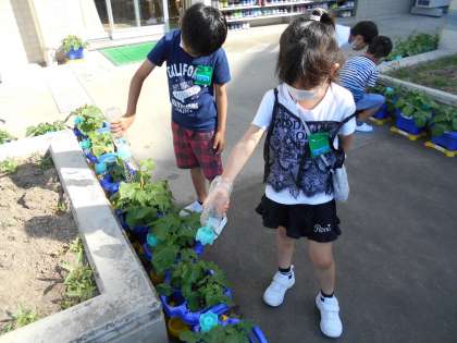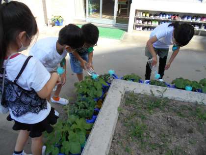 あさがおを学校まで持ってきてくださり、ありがとうございました。葉はどんどん大きくなり、中にはつるが伸びてきたものもあります。子供たちは毎朝水やりをしながら、その生長を楽しみにしています。