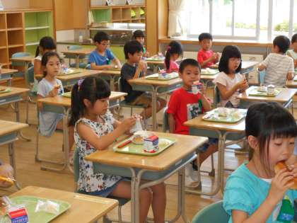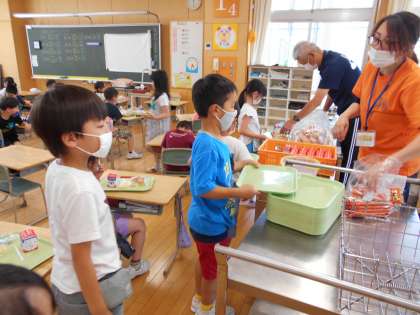 配膳は、教員が行い、子供たちは「密」に気を付けて並びます。