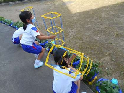 あさがおのつるが伸びてきたので支柱を立てました。のびのびと大きく育つように願いながら活動しました。