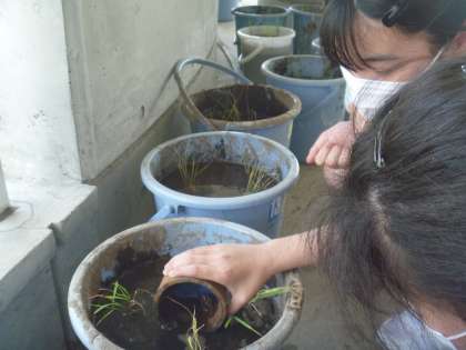 バケツ稲を観察している児童の姿が見られました。ペアで世話をしているので、誘い合って楽しく休み時間も見に行っている様子が見られます。密にはならないように声をかけ、稲の生長を見守るよう指導していきます。