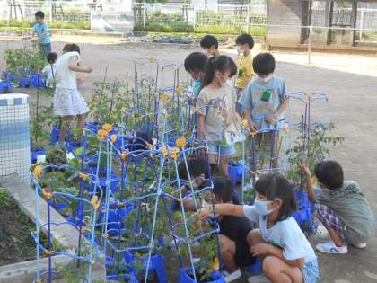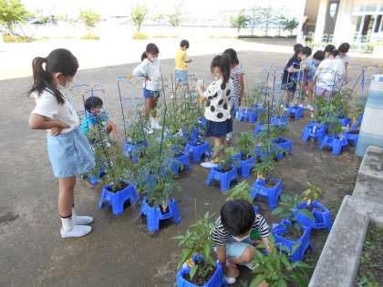 登校後、ランドセルを片付けると、野菜の水遣りをしています。「○○君のピーマンが、もう食べられそうだよ」「エダマメの赤ちゃんみたいなのが、できたよ」と、毎日、野菜の生長を楽しみにしています。