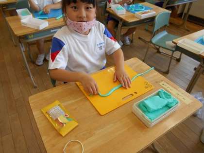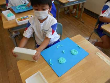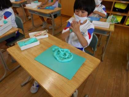 今日は、図工で粘土を使った学習を行いました。粘土を伸ばして紐状にし、そこから思いついたものを表しました。キャンディやへび、かたつむり等、様々なものを表現することができました。