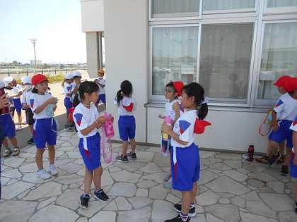 日陰での水分補給の時間をとりながら、グラウンドで体育科の学習を行っています。走ったり、立ち幅跳びの練習をしたりして、元気に運動しました。