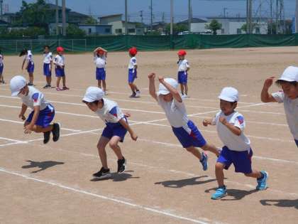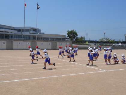 日陰での水分補給の時間をとりながら、グラウンドで体育科の学習を行っています。走ったり、立ち幅跳びの練習をしたりして、元気に運動しました。