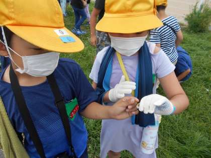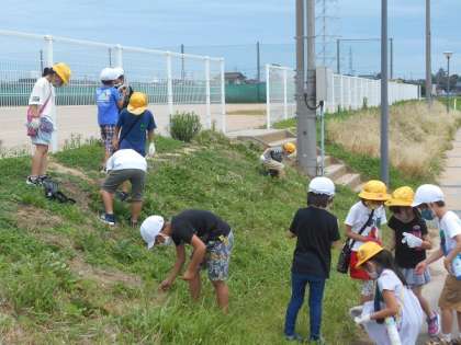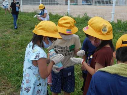 グラウンド横の草むらで、生き物探しをしました。バッタやカエル、ダンゴムシ等、たくさんの生き物を見付けることができました。