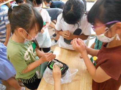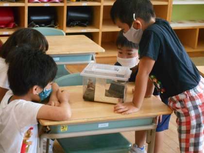 ダンゴムシやカエル、バッタ等を観察しました。「カエルの足は、ペタペタくっつくよ」「ダンゴムシは、上に上っていくよ」と、生き物を不思議をたくさん見付けました。