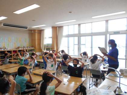 6年生は、「What do you usually do on 〜?」という表現を使って、日常生活を尋ね合う学習を行っています。今日は、ペアでリアクションゲームを行いました。ALTのNova先生の発音に耳を澄ましています。