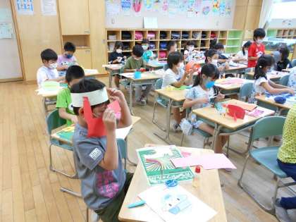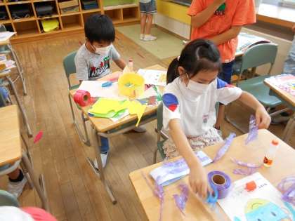 今日は、わっかに飾り付けをしました。変身したいものに近づけるよう、考えて取り組んでいました。