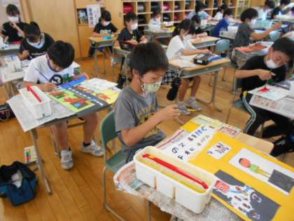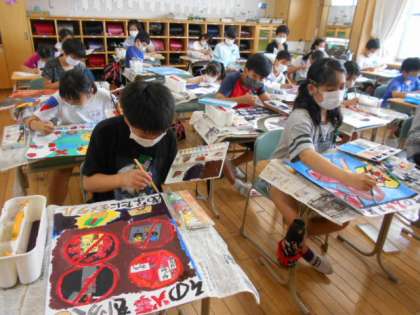 図工の時間には、防火ポスターをかいていました。はっきりとした色になるように、水の量を考えて、彩色していました。