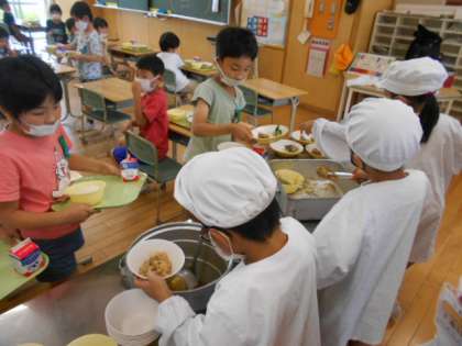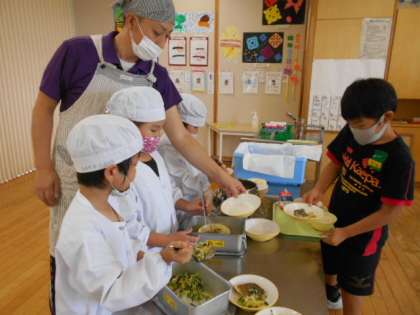 通常給食が始まって3日目。今日は、おかずに野菜の合わせ和えが出ました。久しぶりの野菜の献立も上手に配膳していました。