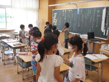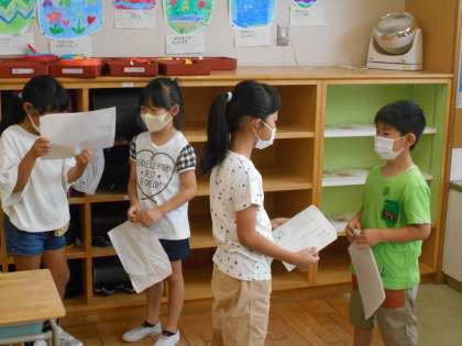前の時間に、「あったらいいな」と思うものを絵に描きました。今日は、友達同士で「どうしてあったらいいと思ったの」「それは、どんな形や色をしているの」などと質問をし合って、詳しく考えました。