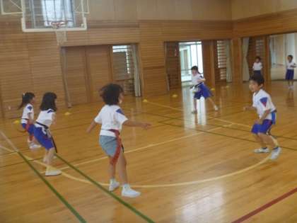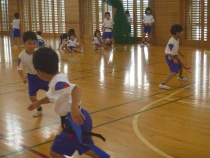 子供たちは、相手にタグをとられないように、空いている場所を見付けて速く走ったり、身をかわしたりしています。