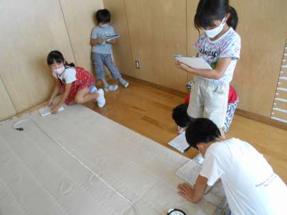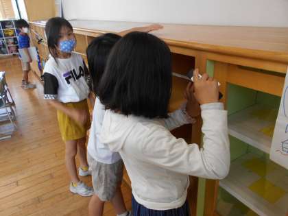 ランドセルロッカーや黒板、教室の横と縦の長さ、ワークスペースや階段の手すりなど、たくさんの物を測っていました。