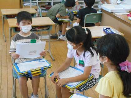 グループになり、あったらいいなと思う物を発表し合いました。聞いた人は、質問をしたり、アイディアや話し方についての感想を伝えたりしました。