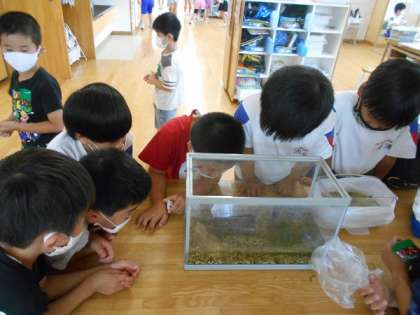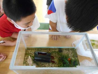 休み時間には、子供たちが水槽をのぞき込んでいます。「いつも隠れているね」「後ろに下がっていくね」と、ザリガニの面白い様子を見て楽しそうです。