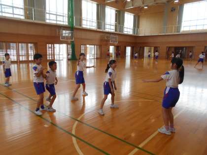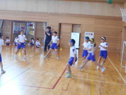 体育の時間にハンドボールをしています。初めてのルールにもようやく慣れ、攻防を楽しめるようになってきました。チームごとに作戦を立てながら、運動しています。