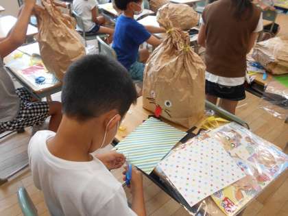 「しんぶんしとなかよし」で使った新聞紙を紙袋に詰めました。リボンで結んで耳にしたり、目の表情を変えたり、工夫しながらかわいい仲間を作っています。