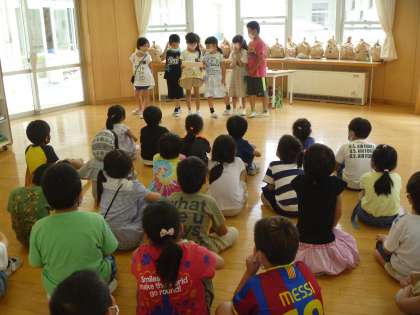 集会係は、みんなを笑顔にするために、景品つきの宝さがしや歌を取り入れた楽しい集会を開きました。