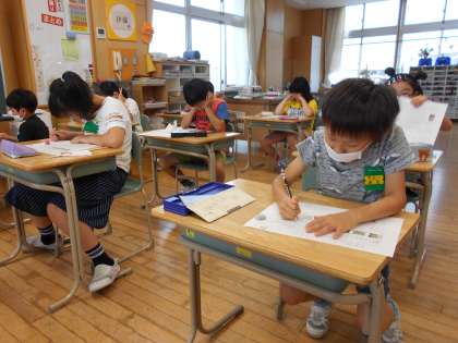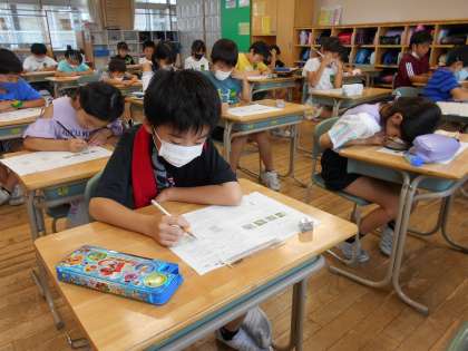 たしかめテストを真剣に考えながら行っている子供たちです。国語科、理科、社会科の順に行い、残すところ算数科です。