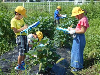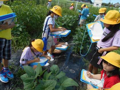 畑に向かうと、「先生!枝豆できてる!」「ヒマワリがすごく大きい!先生より大きい!」