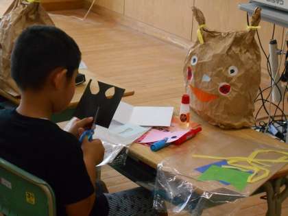 「ぎゅっとしたくなるような かわいい友だちにしよう」を目当てに作品を仕上げました。「しっぽを付けたよ」「お腹にも模様を貼ったよ」などと言いながら、作品づくりを楽しみました。