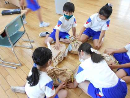 紙袋をくしゃくしゃして、古新聞を詰めました。そして、ぎゅっとしたくなる、かわいい友達をつくりました。作った後は、かわいい友達同士が、楽しく遊んでいました。