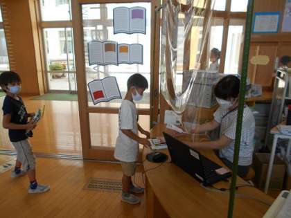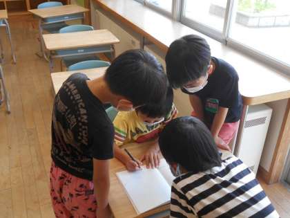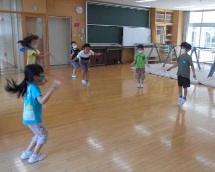 友達と一緒に、お絵描きを楽しんだり、縄跳び練習をしたりしています。図書室で、本を借りる子もいます。