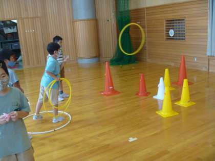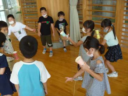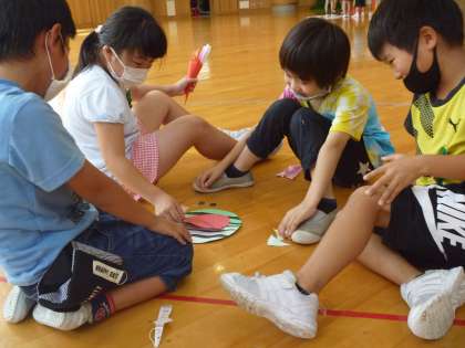ゲーム係と工作係がコラボレーションして、みんなが楽しめるイベントを計画しました。輪投げ、魚釣り、福笑い、けん玉の4つの工夫を凝らしたコーナーで楽しみ、景品をもらって、とても楽しい時間を過ごしました。