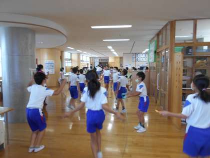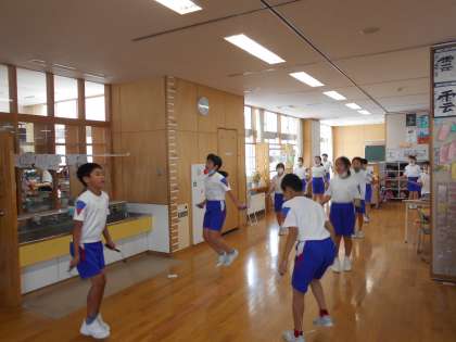 サンサンタイムに運動委員会が実施する、「リズム縄跳び」に参加しました。曲に合わせて1分間みんなで縄跳びを跳び、楽しく運動する姿が見られました。