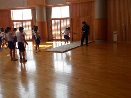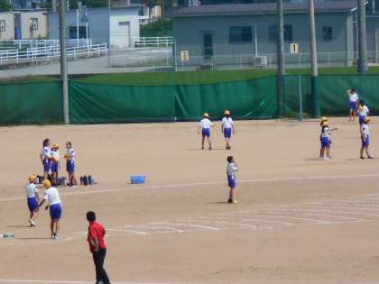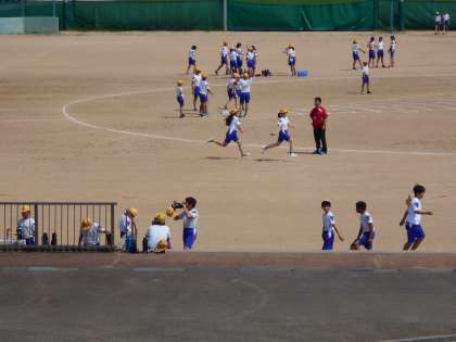 6年生は、グラウンドでリレーの練習。ソフトボール投げに挑戦。