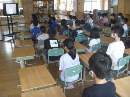 今回は全校がアリーナに集まることはせず、各教室にて行いました。校長先生の言葉や代表児童の言葉は各教室のテレビに配信されました。