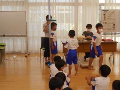 2学期始めの発育測定と視力測定が行われました。自分の番が来るまで、静かに待つことができました。