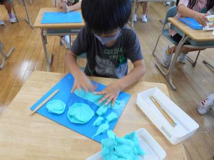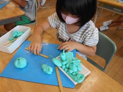 粘土を使って、「ごちそう」を作りました。子供たちは、お寿司やピザ、たこ焼き等、おいしそうなごちそうをたくさん作っていました。