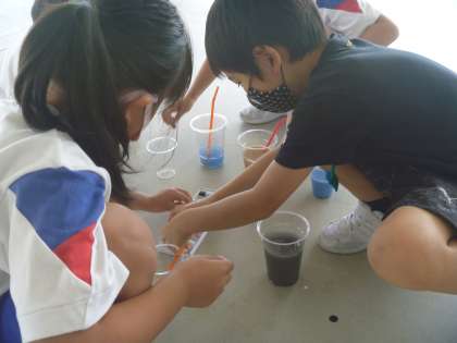 図工の時間に、絵の具を使って色水を作りました。絵の具が水に溶けた様子を見て、ジュースみたい!おいしそう!と喜んでいました。友達の作った色水と混ぜ合わせて色作りも楽しんでいました。