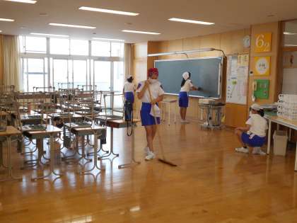 フレンドリー清掃に向けて、クラスごとに清掃するのではなく、6年生は学年のフレンドリー班で取りくんでいます。6年教室に加えて、特別教室等、1年教室の清掃に励む6年生の姿です。