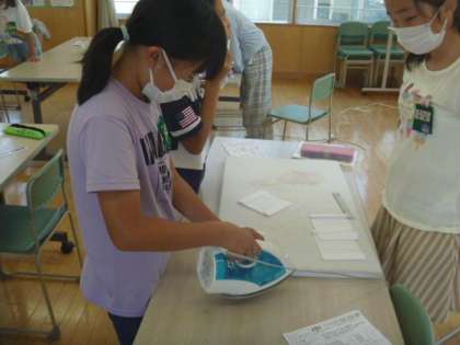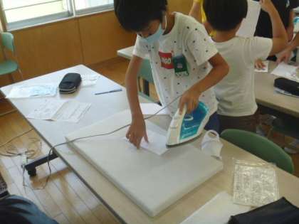 家庭科の学習では、マスク作りに取り組んでいます。子供たちは、しっかり折り目が付くように気を付けて、縫いやすくなるように丁寧にアイロンを掛けました。