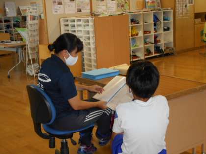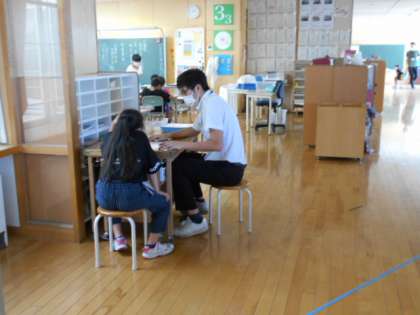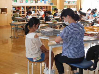 1学期のがんばりについて、担任の先生から一人一人説明を聞きながらもらいました。