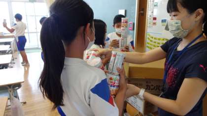 避難訓練後、富山県災害救助物資のカンパンの缶を1人1缶配付しました。これを機会に、災害時の備えについて話し合ってみてはいかがでしょうか。