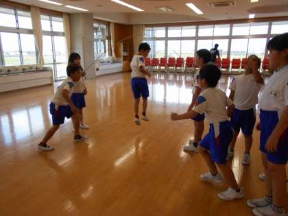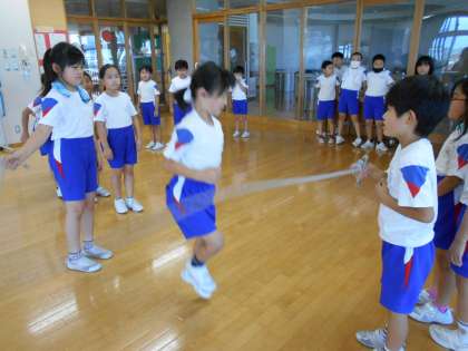 体育科の学習では、ランチルームで大縄跳びを行いました。