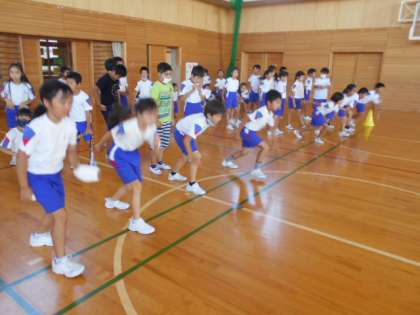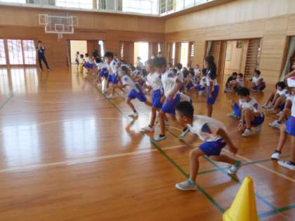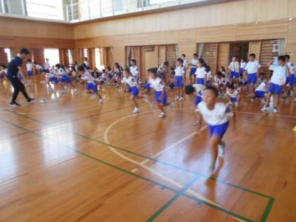 3年生は健康観察後、アリーナで体力つくりを行いました。今日はランRUNオリンピックに向けて、ダッシュの練習を行いました。