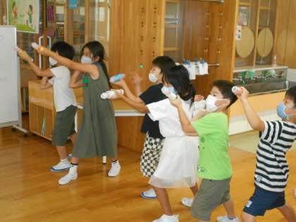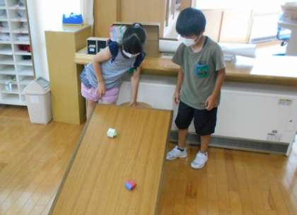 動くおもちゃ作りが進むにつれて、遊び方を工夫するようになってきました。みんなで並んでロケットを飛ばしたり、長い坂を使っておもちゃを転がしたり、いろいろな遊びをしていました。