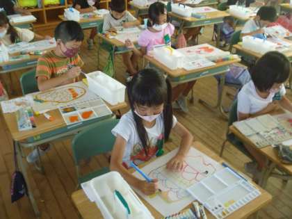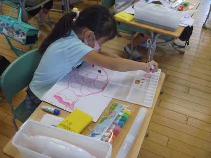 バケツや絵の具、パレットの置き方や絵の具の出し方など、一つ一つ確認して行いました。パレットに絵の具を出して筆にとり、色を塗るとき「緊張する」と言いながら、どきどきして色塗りをしていました。