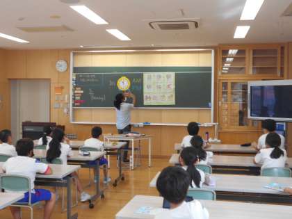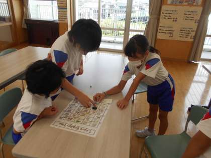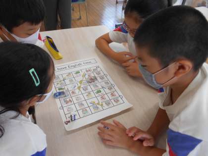 「スネークゲーム」というすごろくを使いながら、同じグループの友達と楽しみながら英語に慣れ親しむ姿が見られました。