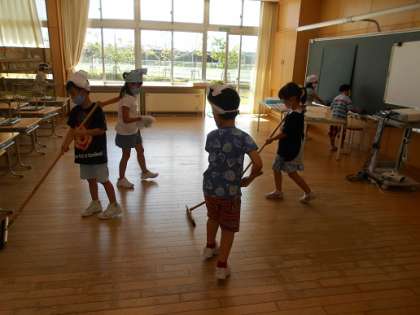 1年生は、掃除の時間に間に合うように、時計を見て行動しています。掃除の仕方を覚えて、静かに落ち着いて取り組むことができるようになってきました。