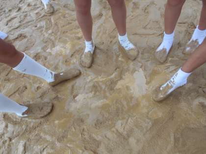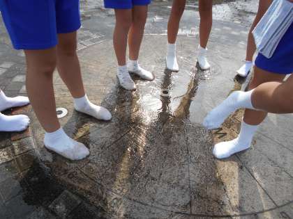 家庭科の学習では、洗濯実習を行いました。まずは雨でぬかるんだグラウンドにて、靴下を汚しました。「変な感覚。」「気持ちいいかも。」と、楽しみながら靴下でグラウンドを走り回りました。