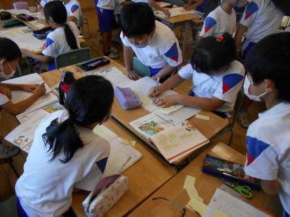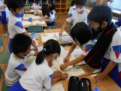 「子供探検隊として山小屋に三日間すごすことになりました。自然とふれ合うなら何を持って行きたいですか?」という問いから、子供たちはグループになって真剣に考え、話合いをしていました。