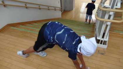 黙働清掃に懸命に取り組んでいる子供たちです。隅の方に溜まっているほこりも見逃さずに掃除しました。